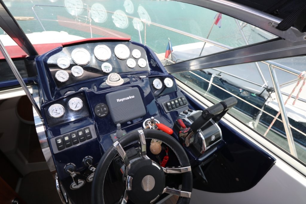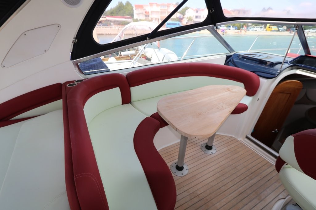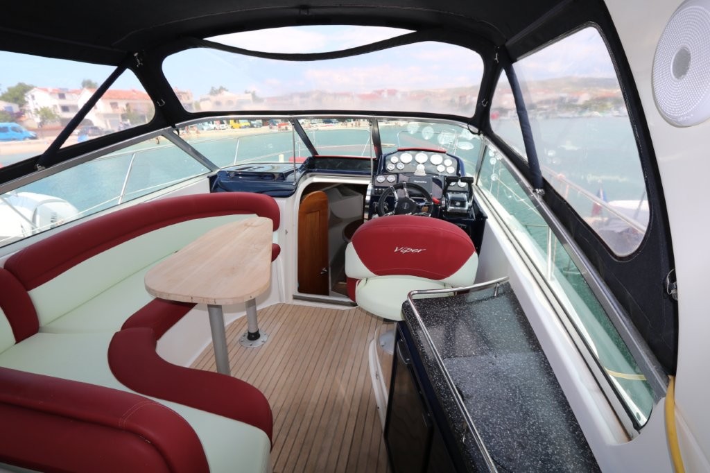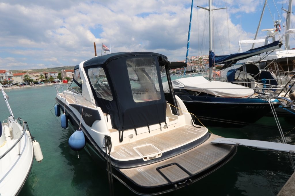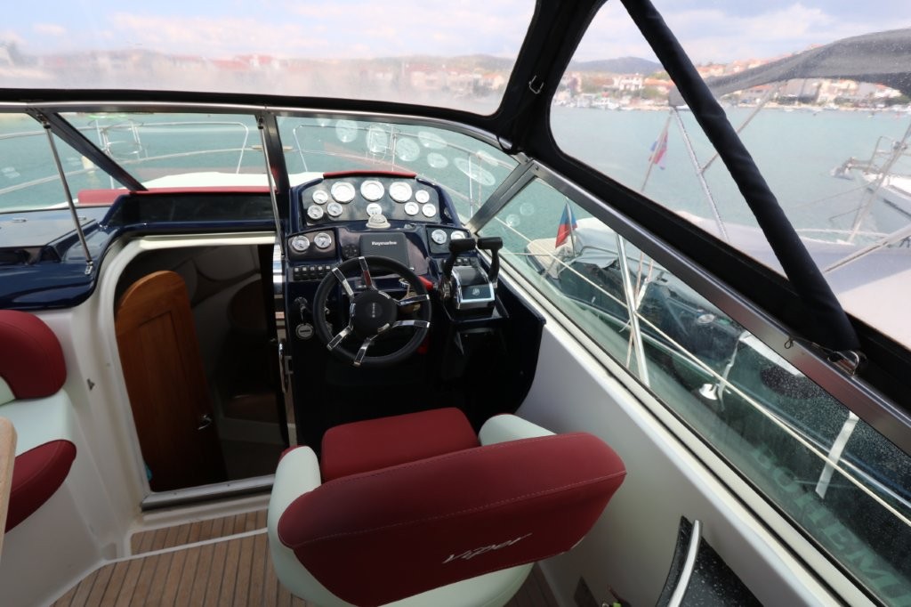 The Viper 303 speedboat with a cabin from 2014 is located in Rogoznica, Croatia, has an overall length of 9.55 m and a width of 3 m. It is powered by two MERCRUISER gasoline engines with a power of 188 kW each. After 400 hours of engine operation, all the cuffs, bearings, timing belts, trim sensors were changed, and underwater lights, new batteries, new awnings on board plus a winter awning were installed. The boat has teak in the cockpit and around the boat, and an extended platform. VAT is included in the price. If you would like more information about this boat, please contact us by phone or email.